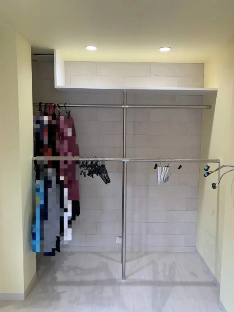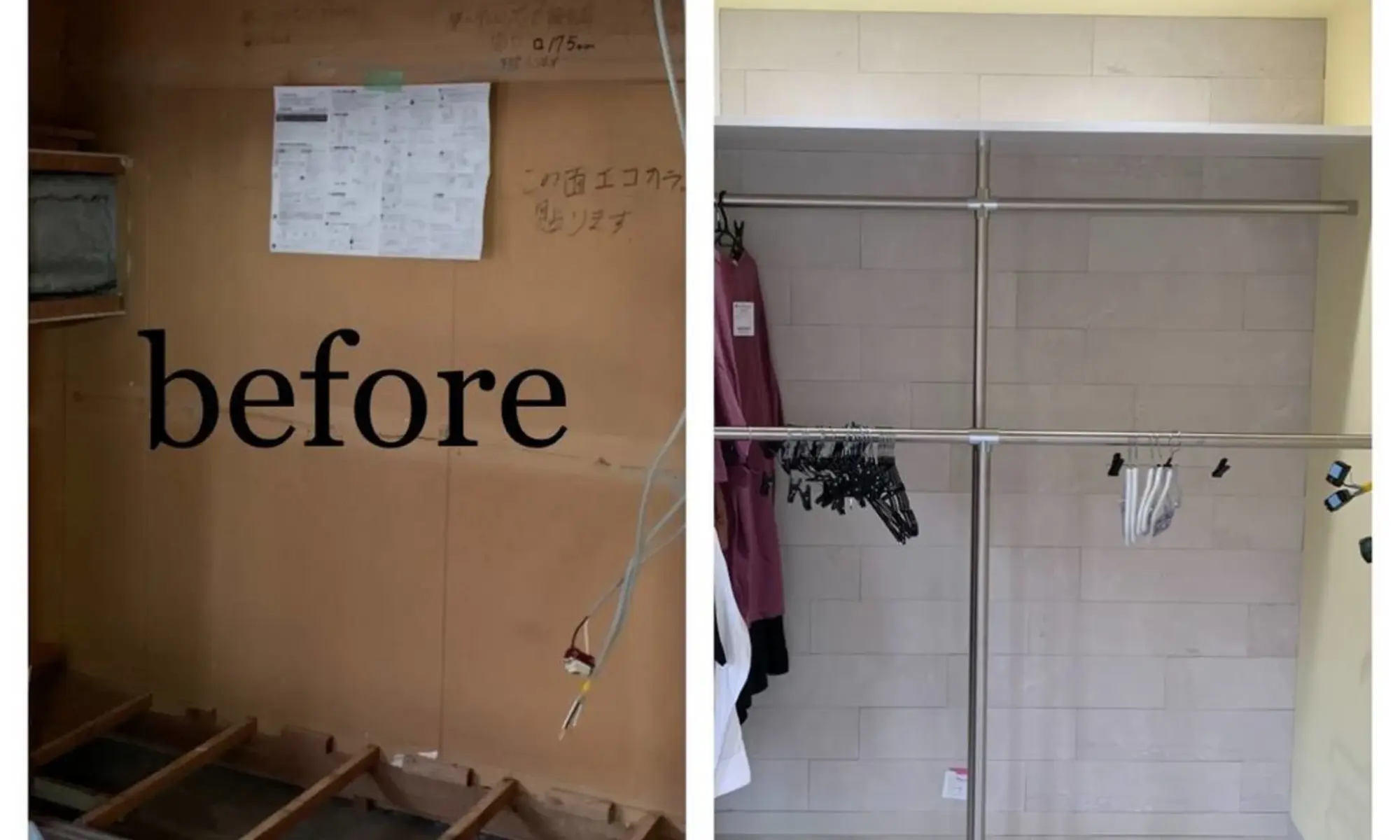 押入れを撤去しハンガーパイプ+棚を設置しダウンライト新設、カビが気になるので換気扇と壁面に調湿、消臭効果のあるエコカラットを貼りました